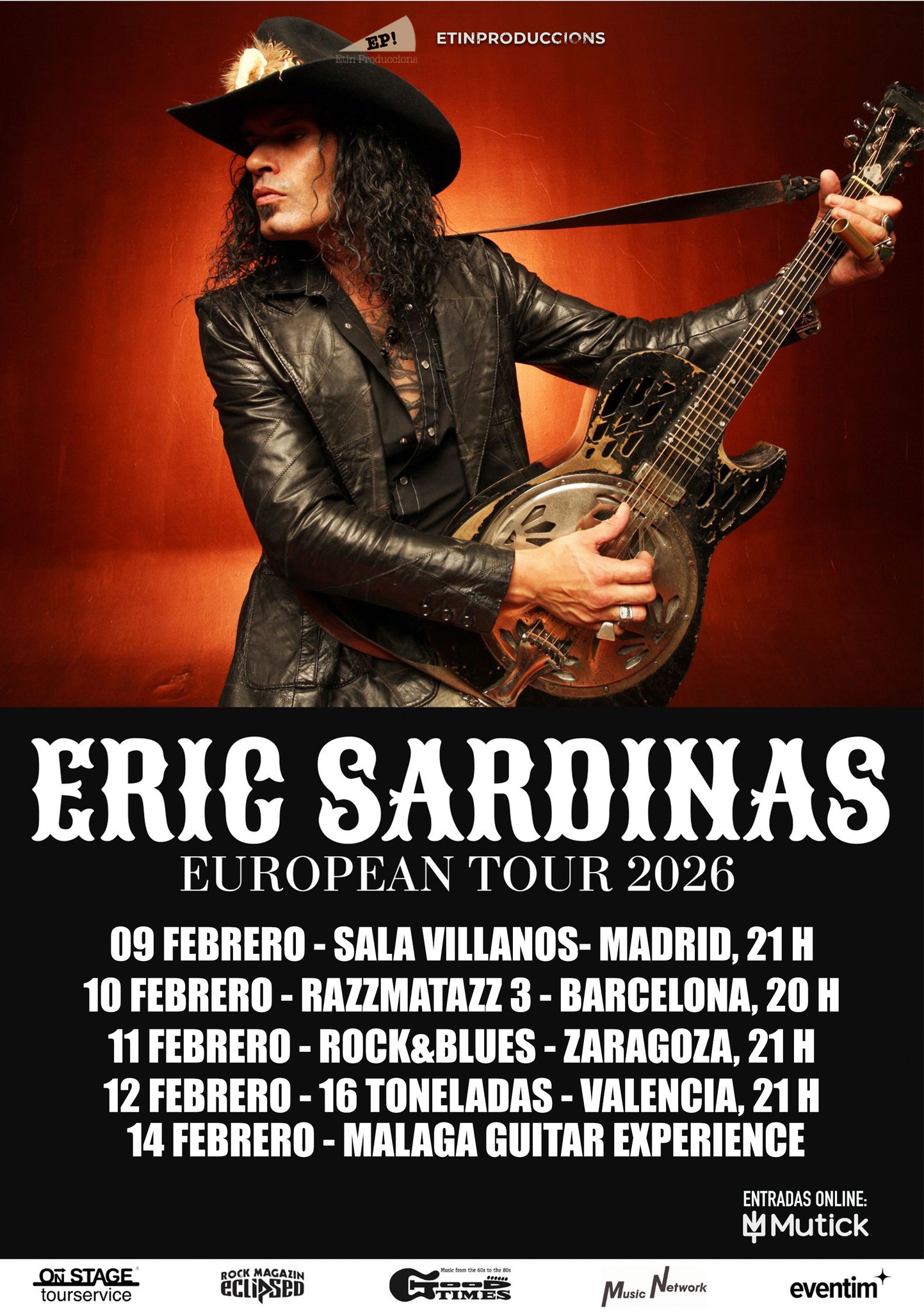 Gracias a Etinproduccions, el maestro del slide guitar e icono del Blues Rock, Eric Sardinas, regresará a España en febrero de 2026 con una serie de conciertos que prometen pura electricidad y alma. Acompañado por su banda Big Motor, presentará temas de su último álbum "Midnight Junction" además de todos sus clásicos.