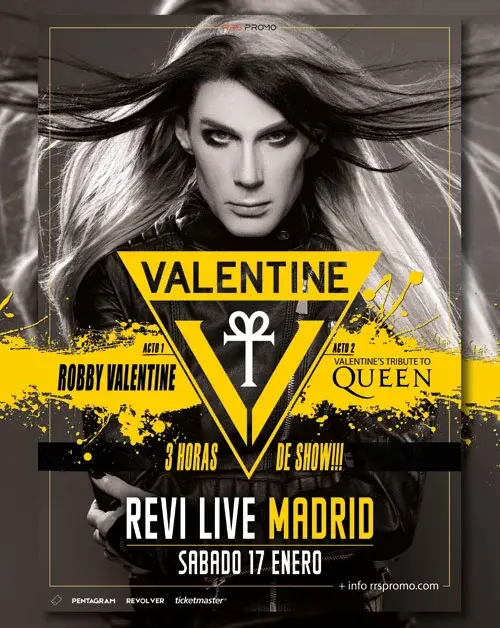 El vocalista y multinstrumentista neerlandés Robby Valentine anuncia una fecha única en Madrid para ofrecernos un set muy especial dividido en dos partes. En la primera interpretará temas propios, incluídos seguro algunos de su más reciente álbum "Embrace the Unknown", y en la segunda ofrecerá un tributo al enorme grupo británico Queen, interpretando sus clásicos atemporales. Un total de 3 horas de actuación que harán las delicias de todos los asistentes.